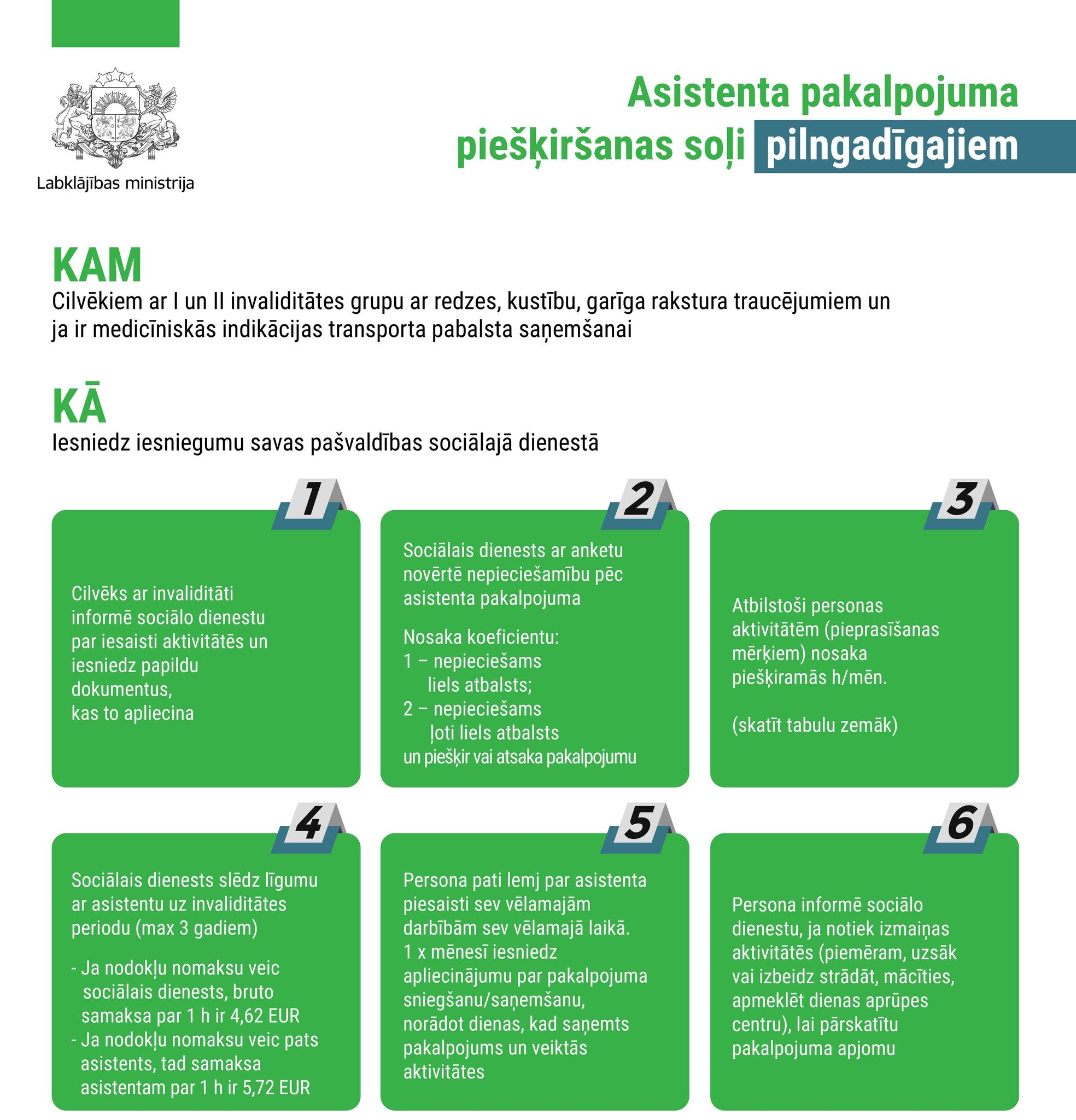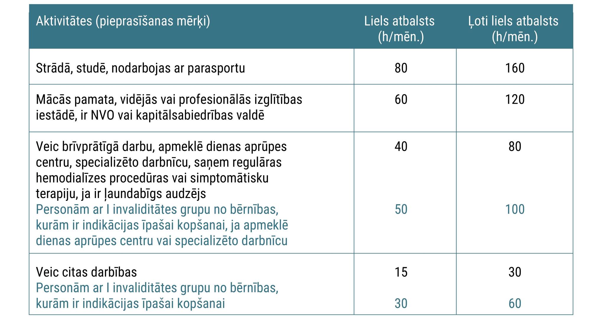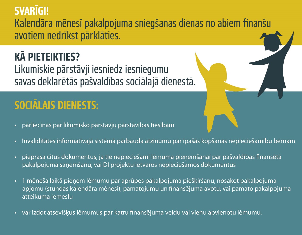 "Aprūpes mājās pakalpojumu bērniem ar invaliditāti piešķir bērnam līdz 18 gadiem, kā arī pēc bērna pilngadības sasniegšanas līdz 24 gadiem, ja pēc pilngadības tiek noteikta invaliditāte, izņemot gadījumu, ja bērns atrodas ilgstošas sociālās aprūpes institūcijā, stacionārā ārstniecības iestādē vai ieslodzījuma vietā. Aprūpes pakalpojums netiek piešķirts laikposmā, kurā bērns saņem asistenta pakalpojumu, atelpas brīža pakalpojumu vai citu sociālās aprūpes pakalpojumu.