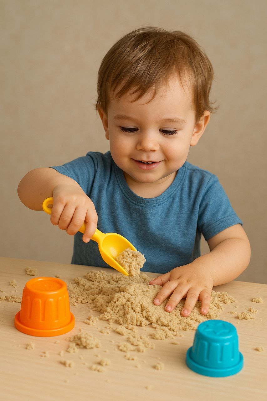 Игра 1. Знакомство с песком. Сам процесс знакомства с песком может растянуться на несколько занятий. Первое, что стоит сделать, просто попробовать его на ощупь. На вид кинетический песок очень похож на мокрый песок, но при этом на ощупь он абсолютно сухой. Попробуйте слепить из песка самую простую фигуру, например небольшой шарик, получаются фигуры, а затем просто надавите на фигуру пальцем и фигура растекается по поверхности. Если пропустить песок сквозь пальцы, он как будто течет. Такие простые занятия с кинетическим песком отлично способствуют релаксации. Теперь, когда вы познакомились с удивительными свойствами песка, можно приступать к играм. Игра 2. Готовим печенья и кексы. Для этой игры вы можете использовать различные формы для выпечки, кулинарные высечки, формы для выпечки и даже скалку. Песок не прилипает к ним, после игры достаточно будет помыть формы и их снова можно использовать на кухне по прямому назначению. Ребенку можно предложить раскатать песок как тесто. Раскатываем кинетический песок скалкой. При помощи форм можно печь печенье различной формы и устраивать настоящее чаепитие для кукол и игрушек. Отлично впишется в эту игру игрушечная плита, если она у вас есть. Можно выкладывать печенье на тарелки определённых цветов, можно посчитать печенье, а затем разложить на тарелки по количеству печенья. Игра 3. Тренируем навыки владения ножом. Все родители очень хотят научить ребенка орудовать этим предметом, но при этом так, же всем страшно доверить нож в неумелые ручки малыша. Кинетический песок станет отличным материалом для тренировки. Из песка вы можете сделать «хлеб», «масло» или колбаски, вручить ребенку пластиковый нож и предложить нарезать хлеба или приготовить бутерброды. Также Вы можете попросить ребёнка поделить торт на 2,4,6 частей и т.д. Посчитать их. Игра 4. Прятки Дети очень любят играть в прятки, и в этом плане кинетический песок представляет собой безграничное поле для игр с детьми разных возрастов. Самые простые прятки в песке можно спрятать несколько маленьких предметов и предложить ребенку найти их. Это могут быть игрушки из киндера, детали конструктора, фигурки от сортера, пуговки, шарики и прочие мелкие предметы. Задача ребенка может быть