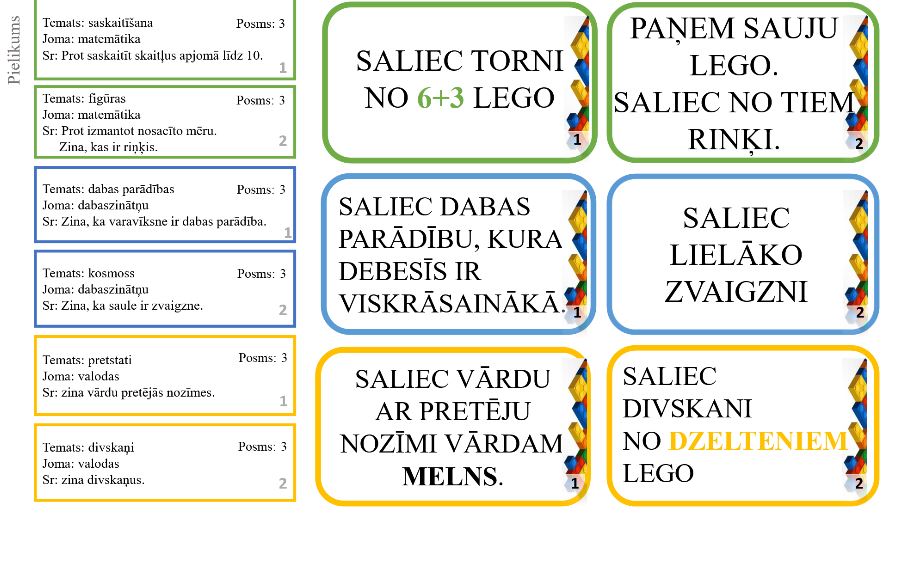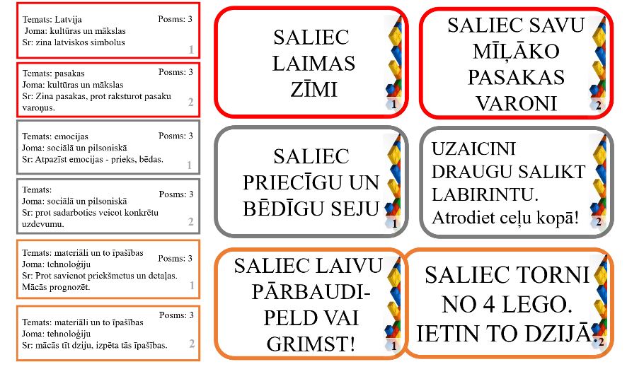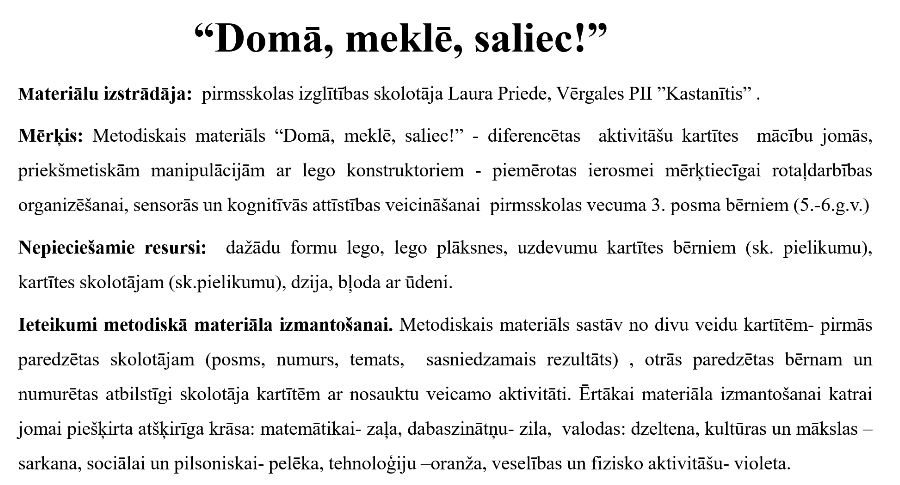 Innovatīvu metožu izmantošana pedagoģiskajā procesā nereti ir izaicinoša, par to aktualitāti un ilgtspēju vislabāk liecina bērnu aizrautība un dabiskā vēlme izzināt jauno un neierasto. Lego aktivitāšu priekšrocība ir to piemērotība visām vecuma grupām. Lego konstruktori ir kļuvuši populāri visā pasaulē , arī mūsu, tehnoloģiju laikmetā, vēljoprojām pilda ne tikai izklaidējošo , bet arī izglītojošo funkciju. Lego terapija ir īpaši izstrādāta metode, kur tiek pielietotas dažāda veida aktivitātes ar lego konstruktoriem. Tās pamatlicējs ir ASV neiropsihologs Daniels Legofs. Pētījumi apliecina lego terapijas pozitīvo ietekmi arī uz bērniem ar saskarsmes , autiskā spektra un citiem attīstības traucējumiem. Manipulācijas ar lego konstruktoriem attīsta smalko motoriku, palīdz stiprināt rokas muskulatūru, palielina uzmanības koncentrēšanas ilgumu. Attīsta vairākas fiziskās prasmes: rokas un acu koordināciju (tiek vingrināta rokas un acu saskaņota darbība, abu roku vienlaicīga darbība). Bērna vēlme īstenot ieceri, virza uz pašvadītu darbību un māca organizēt savu darbaprocesu. Kopīgu projektu realizācija pilnveido un attīsta sākotnējās sadarbības un komandasdarba prasmes. Paralēli problēmrisināšanai, bērni mācās sociālās prasmes -iejūtību, atbildību,pacietību un dalīšanos. Atklāj sevī, un novēro citos, tādas īpašības kā neatlaidību , mērķtiecību,prieku, lepnumu un gandarījumu par saviem sasniegumiem, arī sarūgtinājumu parneizdošanos, un mācās tās izpaust sev un citiem pieņemamā formā. Bērniem, dažāda veida ungrūtības pakāpju īstenoti projekti ar lego konstruktoriem, ir vizualizēts apliecinājums savāmspējām un radošumam un motivācija jauniem izaicinājumiem. (c)